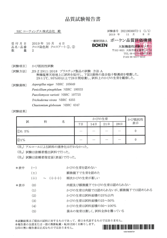 防カビタイプの試験結果です。